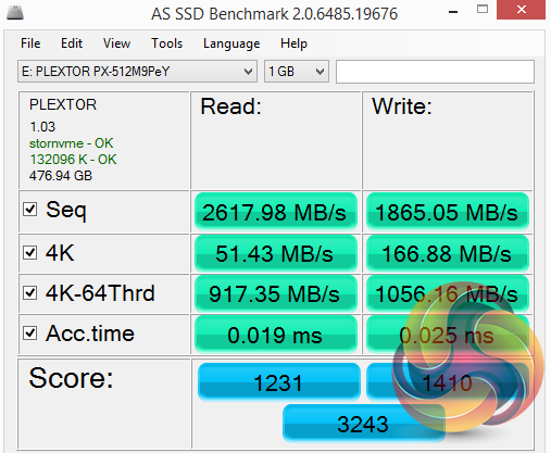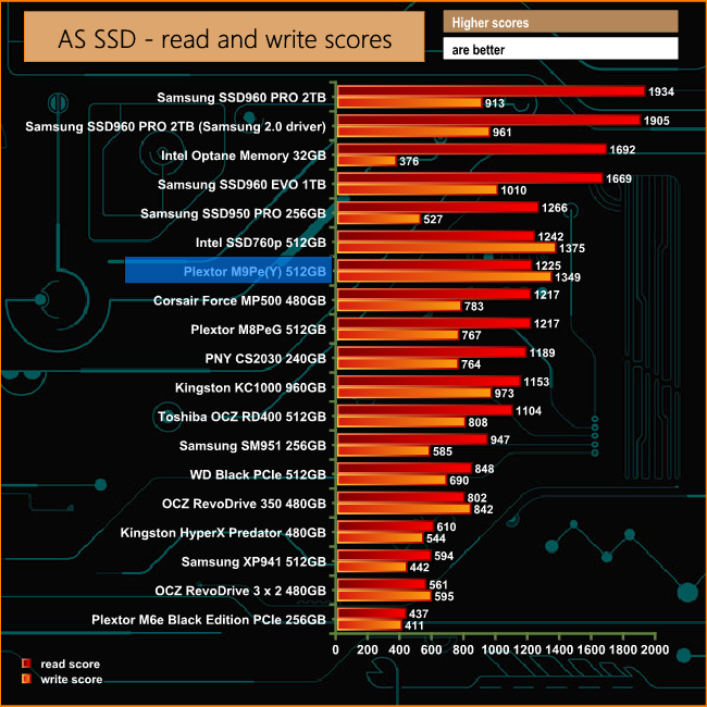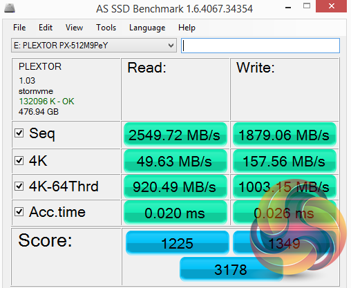 The drive performs well in the more stringent AS SSD test. Its write score of 1349 is the second highest we have seen from a consumer NVMe drive to date.