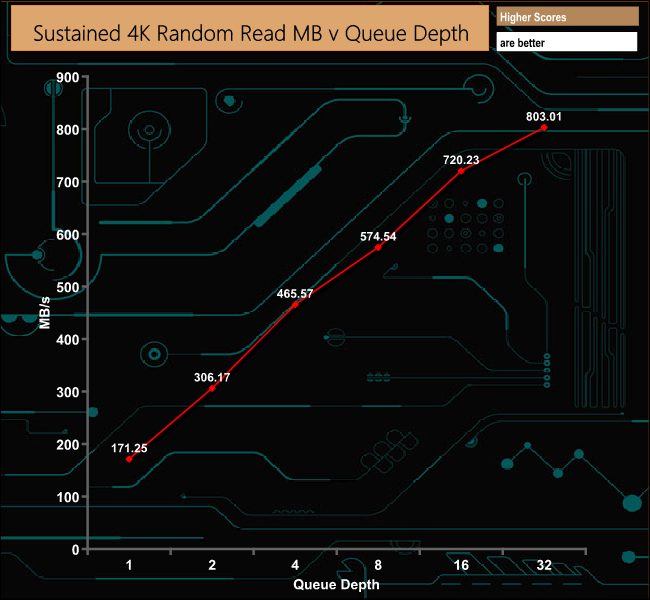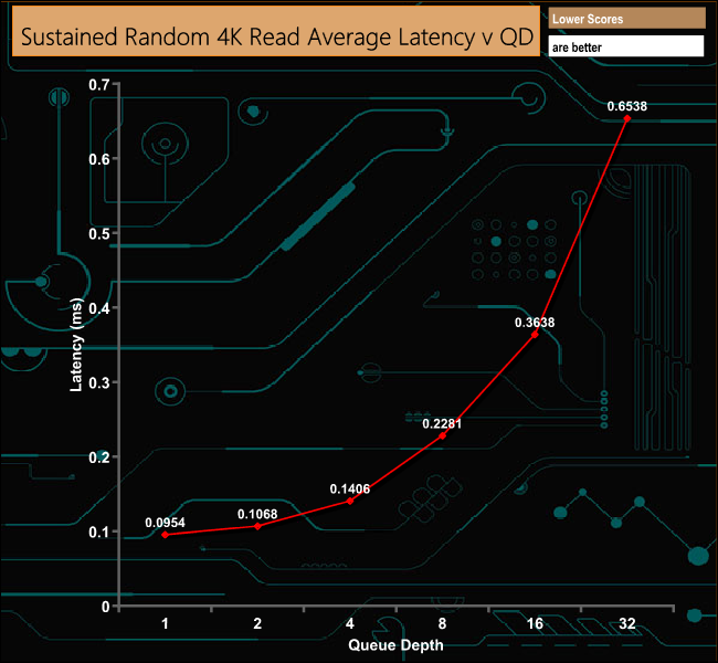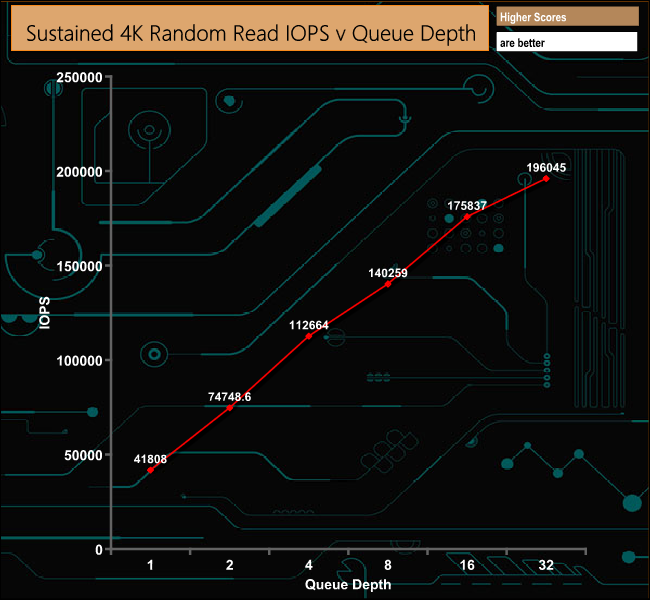 When it comes to 4K Random Reads the performance shows a steady increase as the queue depth deepens delivering 196,045 IOPS at a QD of 32.