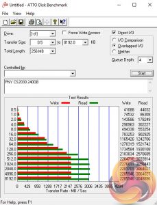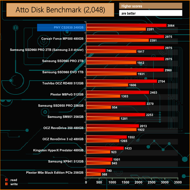 The official Sequential read/write figures for the drive are up to 2,750MB/s and 1,500MB/s respectively which going on the figures got from the review sample drive under the ATTO benchmark seem very conservative, considering we managed to get a read score of 3,064MB/s and 2,281MB/s for writes.
