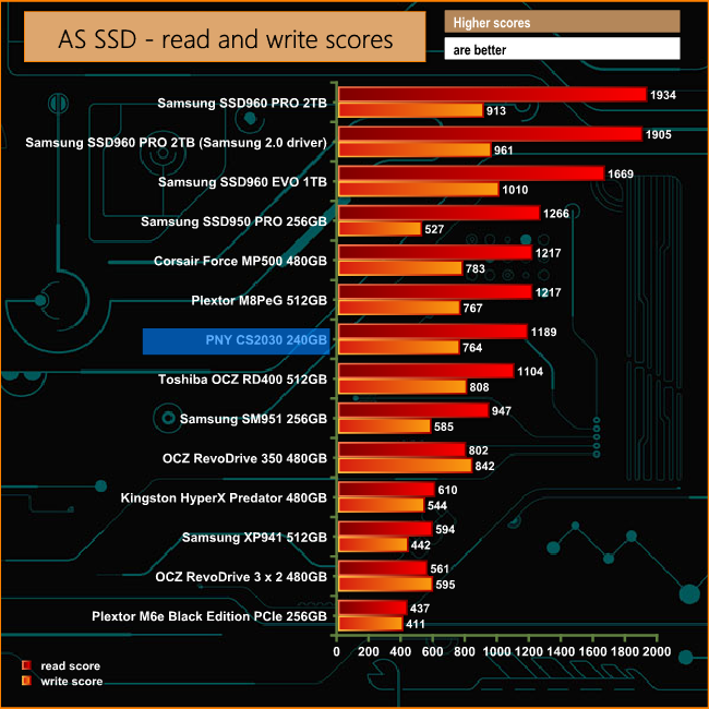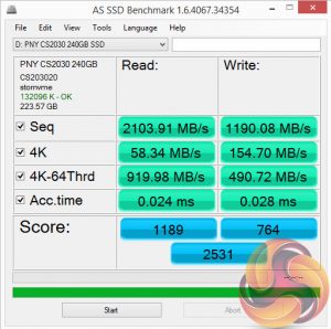 Under the more stringent AS SSD benchmark, those stunning read/write figures we saw in the ATTO benchmark drop to below the official numbers. The drive performs very well at deep queue depths as can be seen from the 4K-64Thrd results.