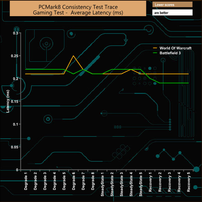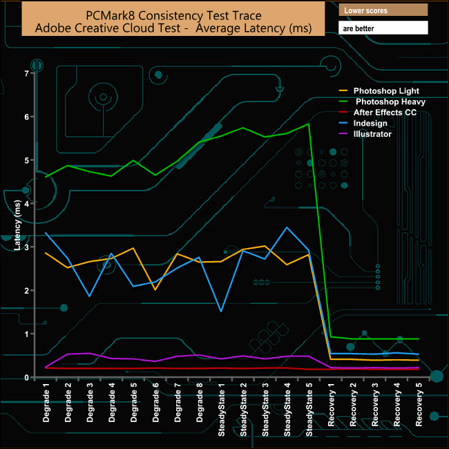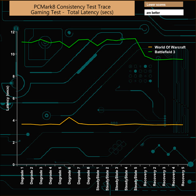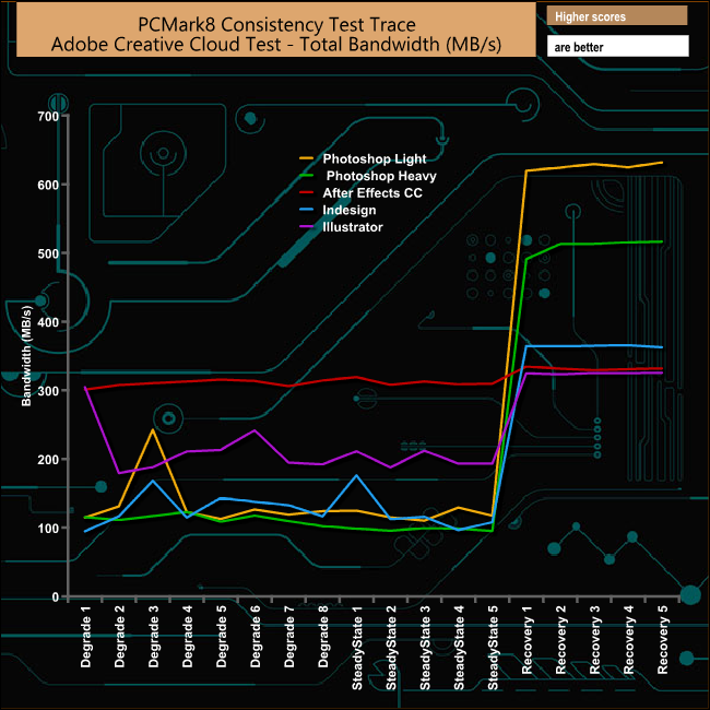 PCMark 8’s Consistency test provides a huge amount of performance data, so here we’ve looked a little closer at how the CS2030 performs in each of the benchmarks test suites.