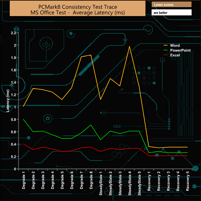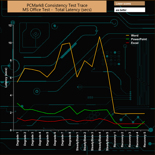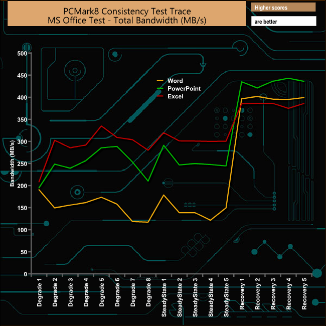 In the Microsoft Office suite, it’s the Word tests that stress’s the drive the most. Once again the drive shows superb recovery from the Degrade and Steady State tests.