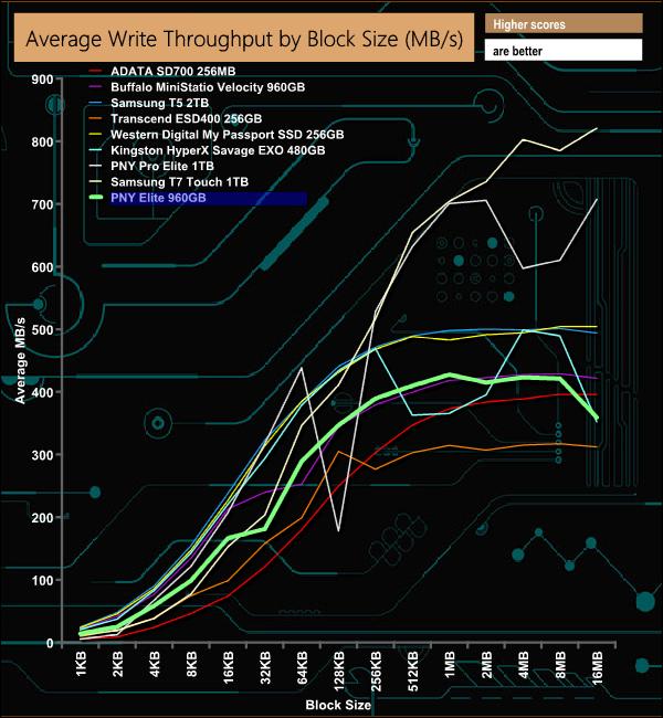 The PNY Elite's performs quite strongly at the beginning of our read throughput test, but at around the 128KB block mark the performance stalls and begins to plateau out.