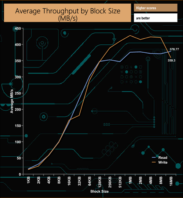 In our throughput test, the reads peaked at 378.77MB/s at the 16MB block mark at the end of the test run. Writes peaked at 427.56MB/s at the 1MB block mark before falling to finish the test at 359.30MB/s