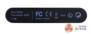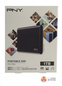 The front of the box has a medium-sized image of the drive, and under the image to the left are the maximum claimed Sequential performance speeds (890MB/s read and 880MB/s write) and the interface type, USB 3.1 Gen2 Type-C. To the right is a box displaying the drives capacity.