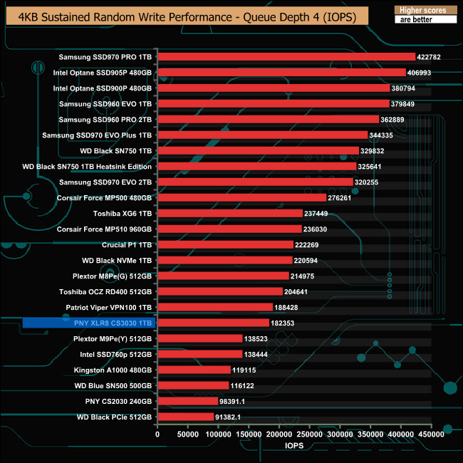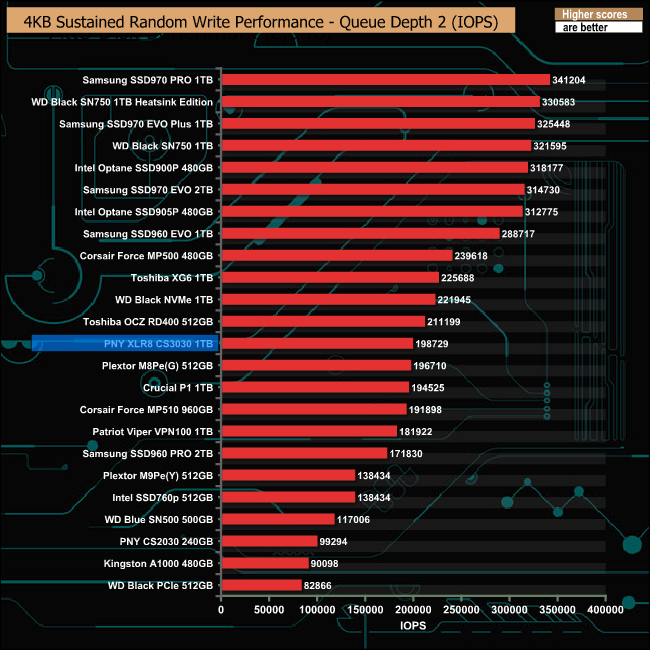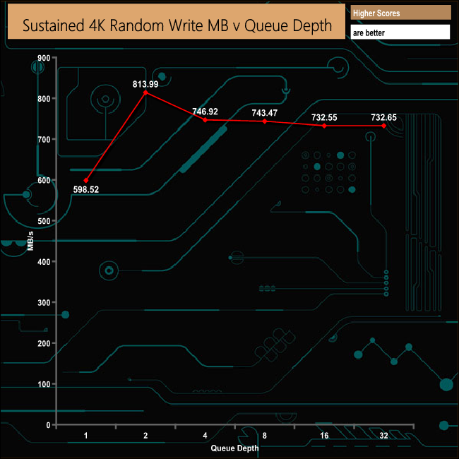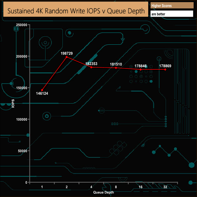 In our 4K random tests, the drive peaked at 198,729 IOPS at a queue depth of 2.