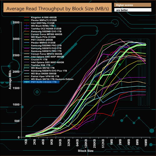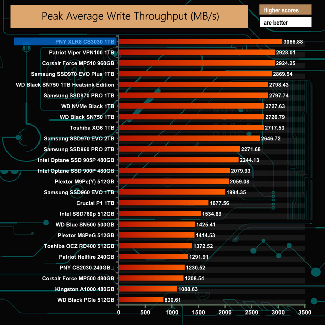 That peak write figure of 3066.88MB/s plants the drive firmly on top of our write throughput chart.