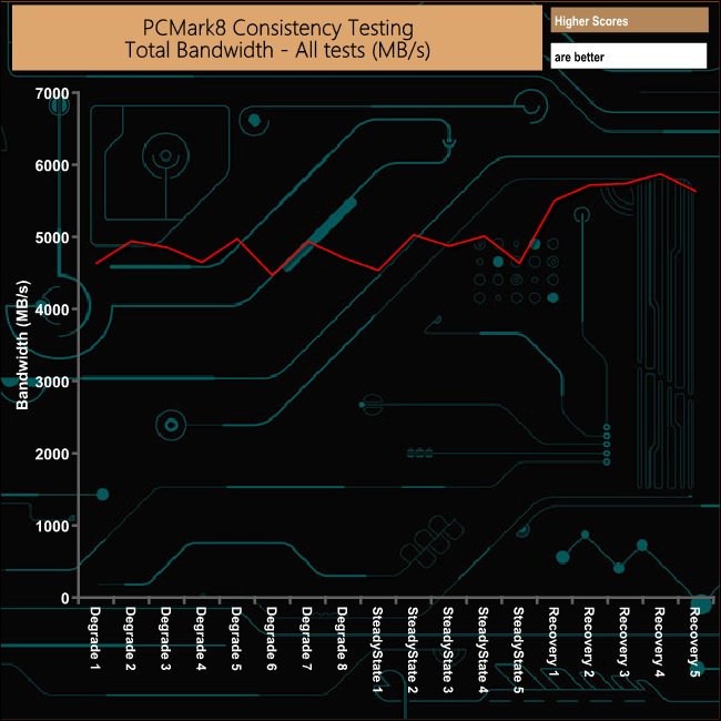 Overall the CS3030 handles the stresses of PCMark 8's Consistency test pretty well with no major drops in bandwidth. It recovers well, but the recovery isn't that consistent.