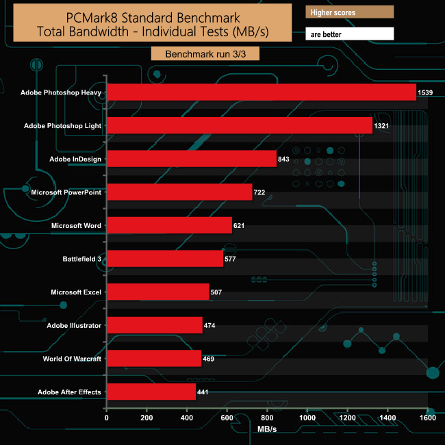 Just like the Consistency test, PCMark 8’s Standard Storage test also saves a large amount of performance data. The default test runs through the test suite of 10 applications three times. Here we show the total bandwidth performance for each of the individual test suites for the third and final benchmark run.
