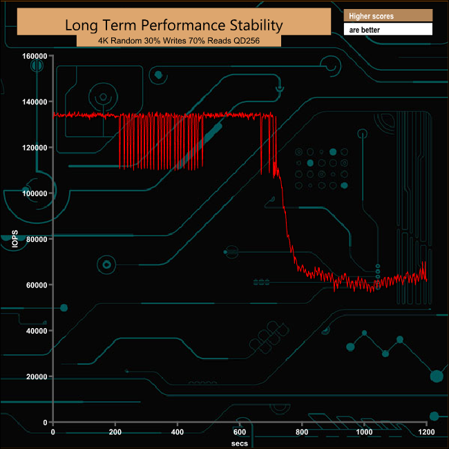 For the long term performance stability test, we set the drive up to run a 20-minute 4K random test with a 30% write, 70% read split, at a Queue Depth of 256 over the entire disk. The 1TB PNY CS3030 averaged 105,314 IOPS for the test with a performance stability of 77.87% which is very good for this class of drive.