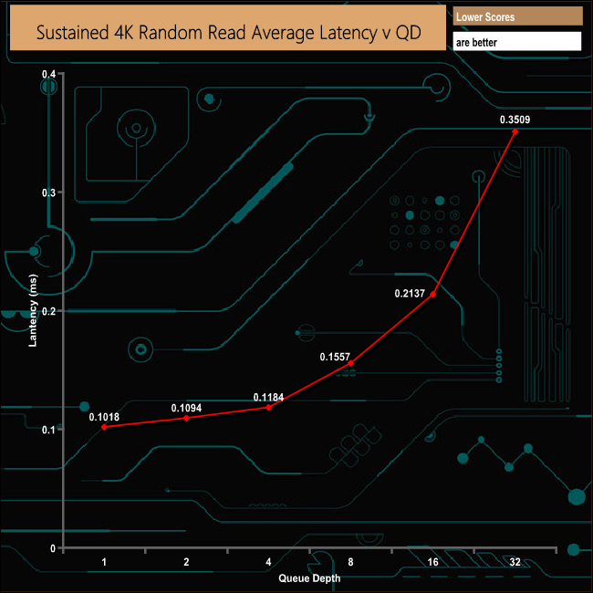 The 4K random read performance of the CS3030 climbs steadily through the queue depths we test at, finishing with an IOPS figure of 364,725 IOPS at a QD of 32.