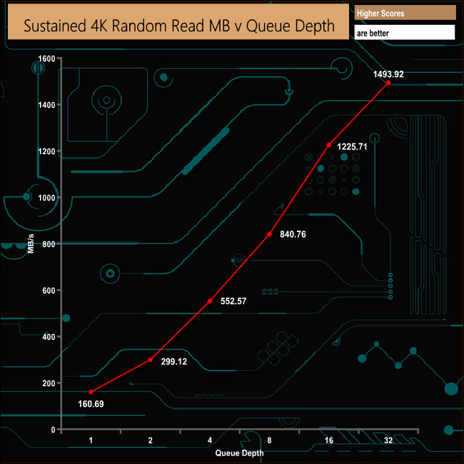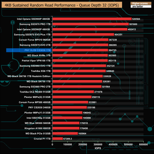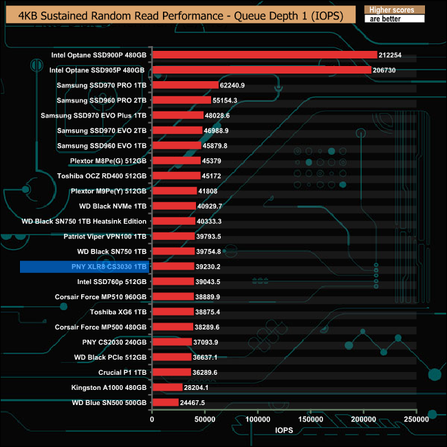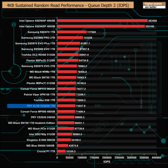 PNY don't quote any 4K random figures for the drive but the 4K random read performance gap between the CS3030 and the previous generation CS2030 widens as the queue depth deepens.