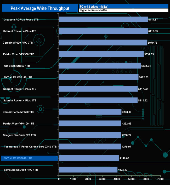 As with the read throughput result, the tested write figure of 4,140MB/s puts the drive into the bottom half of our results chart.