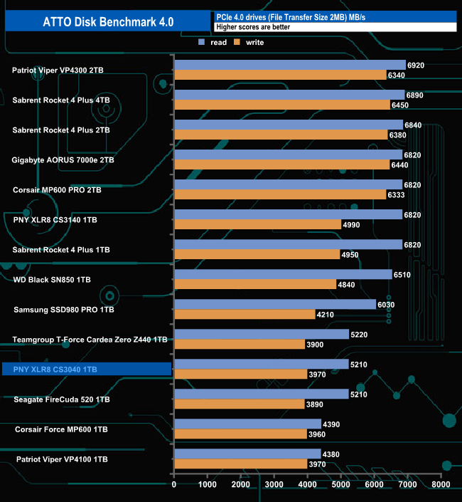 Testing the drive with the ATTO benchmark produced a read result of 5,210MB/s with writes at 3,970MB/s both figures short of the official maximums of 5,600MB/s and 4,300MB/s for read and writes respectively.