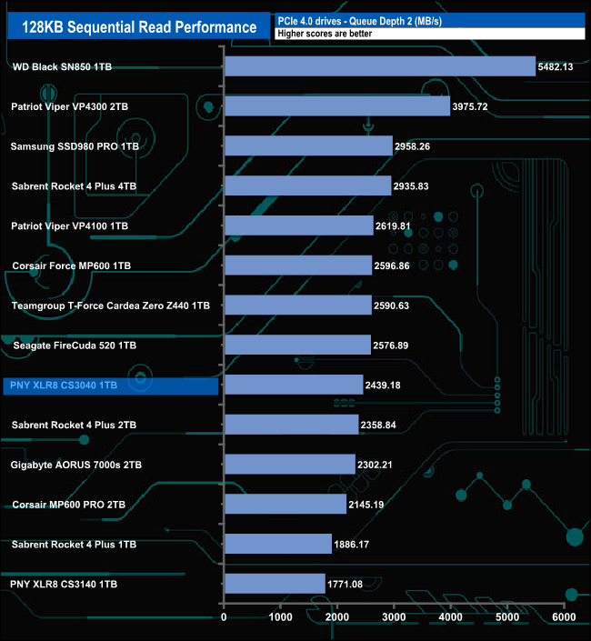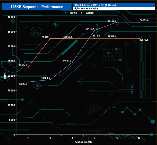 We used CrystalDiskMark 8‘s custom settings to test the Sequential read and write performance of the drive through a range of queue depths. The setup for the tests is listed below.
