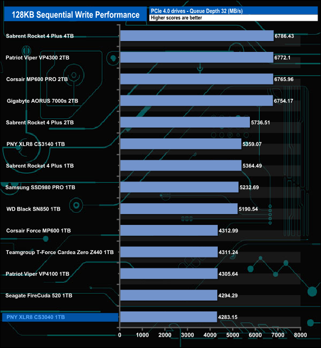 The XLR8 CS3040 sits at the halfway mark in result charts at QDs 1, 2 and 4 but by the QD32 test, it has dropped to the bottom of the list.