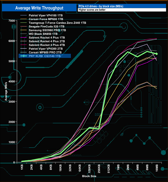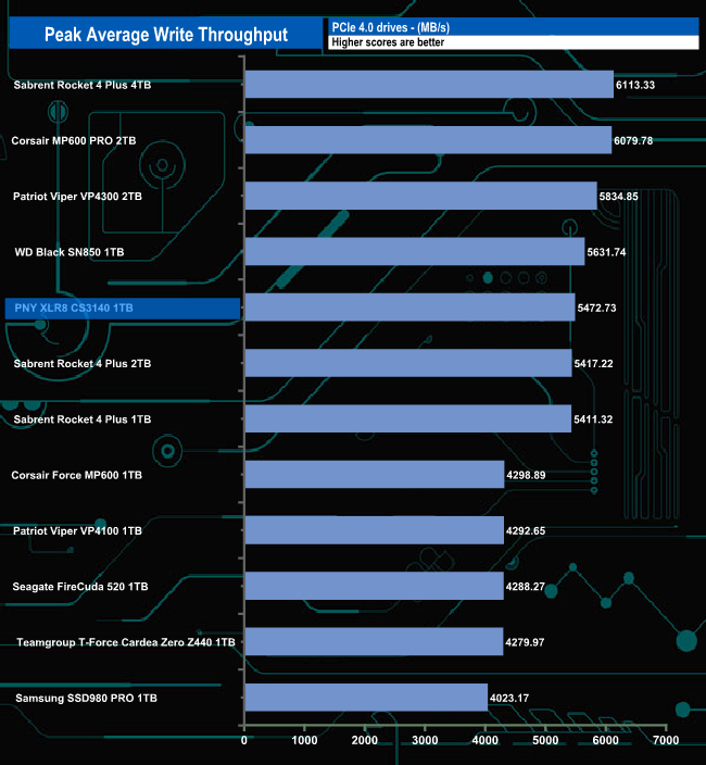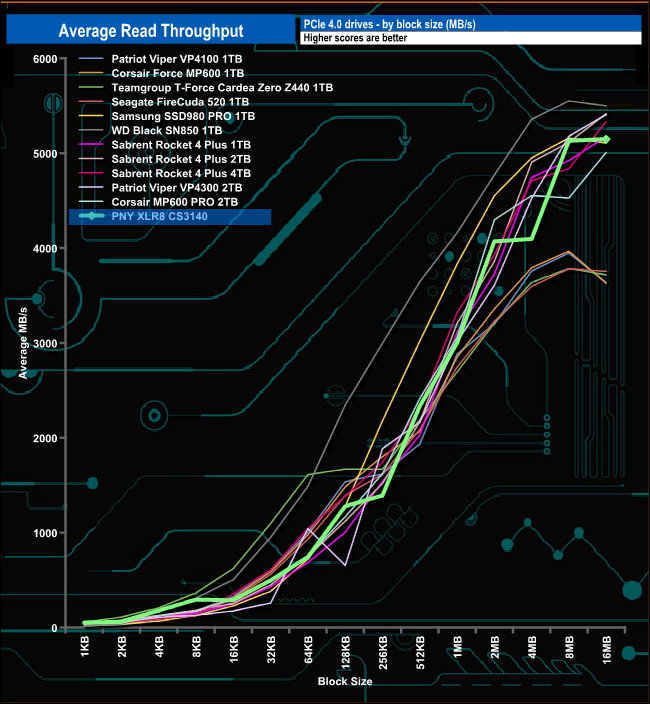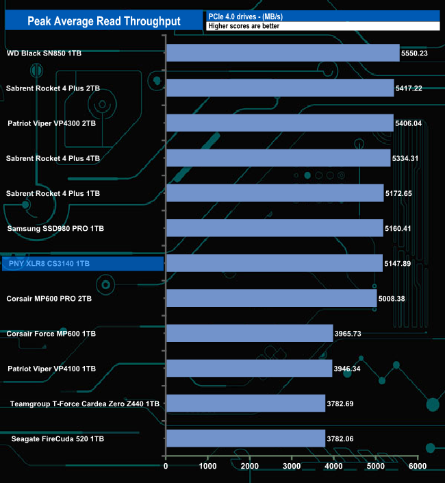 The peak average read throughput speed of 5,147.89MB/s slots the PNY XLR8 CS3140 into the middle of the results chart.