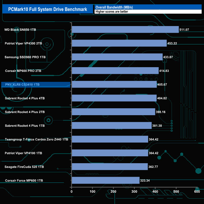 The PNY XLR8 CS3140 handled the PCMark10’s Full System Drive benchmark well with solid scores for all the test traces. The 897MB/s for the Heavy Use Adobe Photoshop trace is very good and also impressive was the 3,738MB/s the drive produced for the cp1 write test.