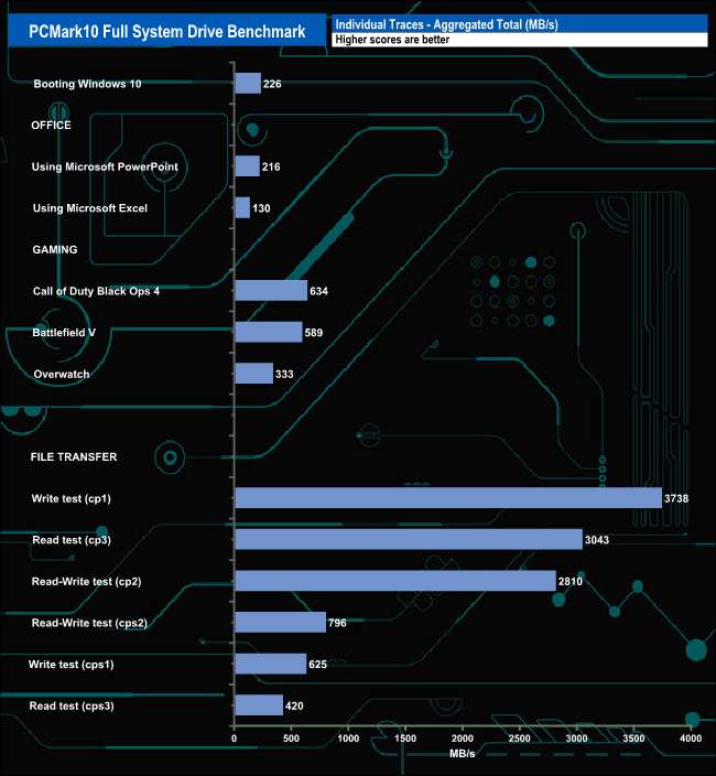 The PCMark 10 Full System Drive Benchmark uses a wide-ranging set of real-world traces from popular applications and common tasks to fully test the performance of the fastest modern drives. The benchmark is designed to measure the performance of fast system drives using the SATA bus at the low end and devices connected via PCI Express at the high end.