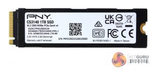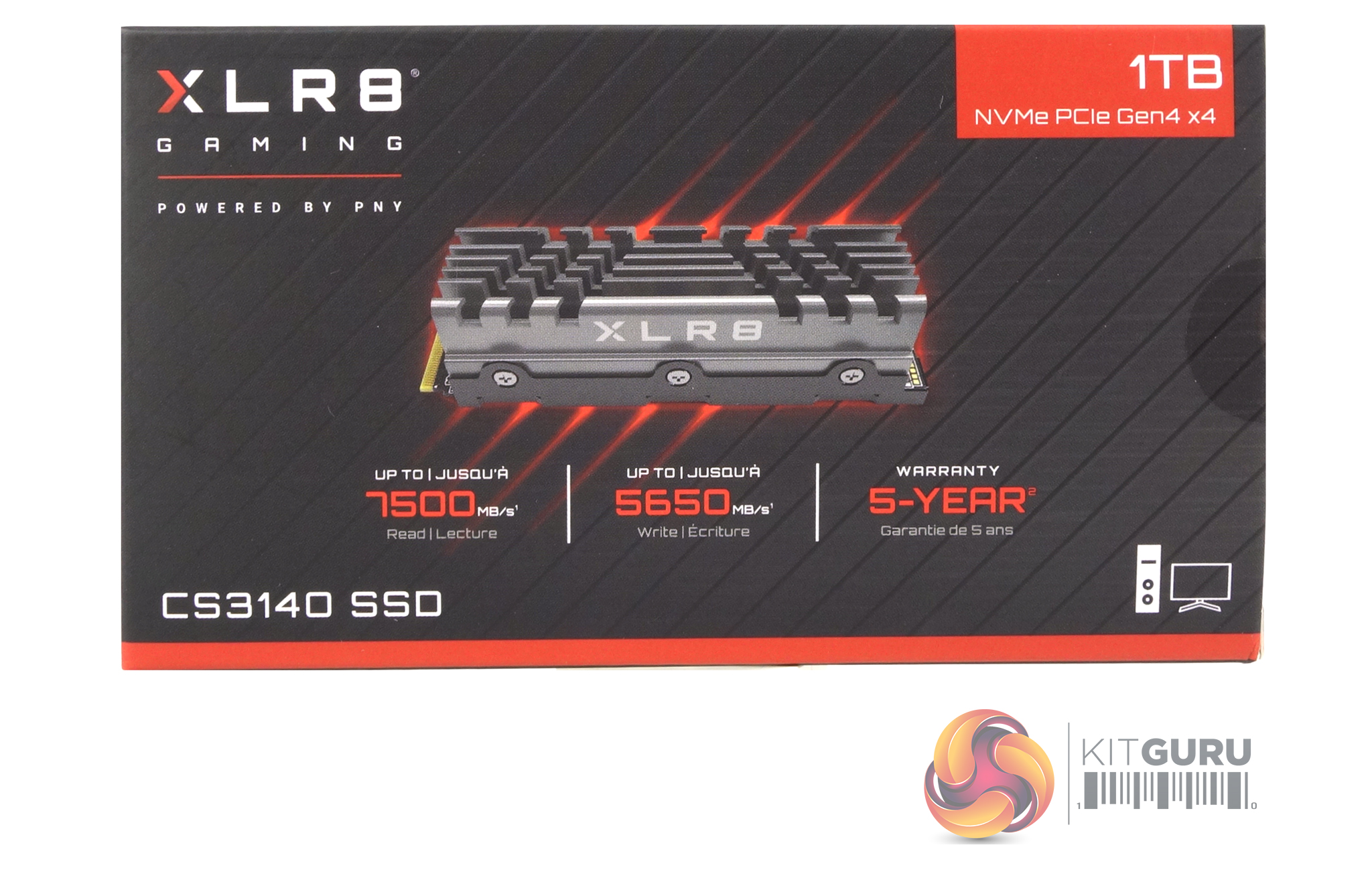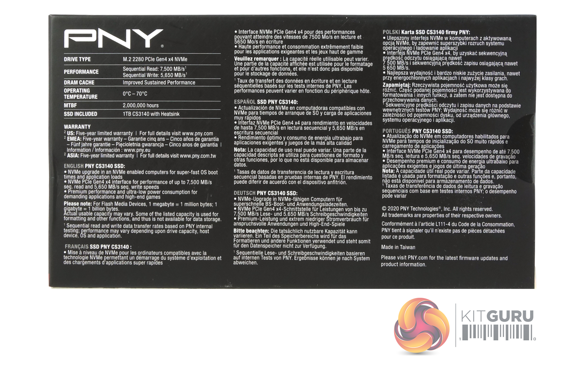 The PNY XLR8 CS3140 comes in a compact box with an image of the drive on the front, along with the drive's capacity on the top right-hand corner. Underneath the drive image we find the read and write sequential speeds along with the drive's warranty length. The rear of the box has a very small product info panel but most of the back is taking up by multilingual marketing information.