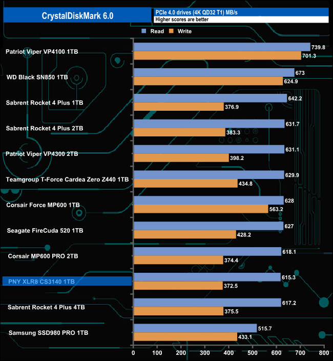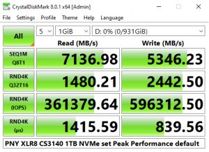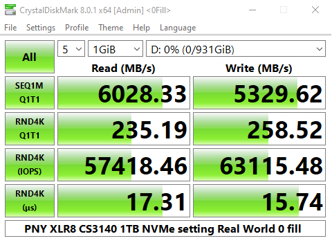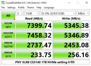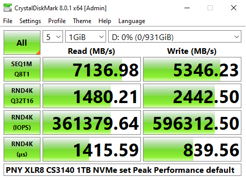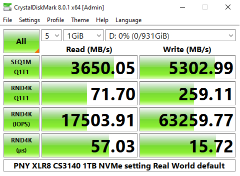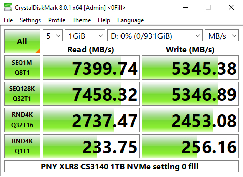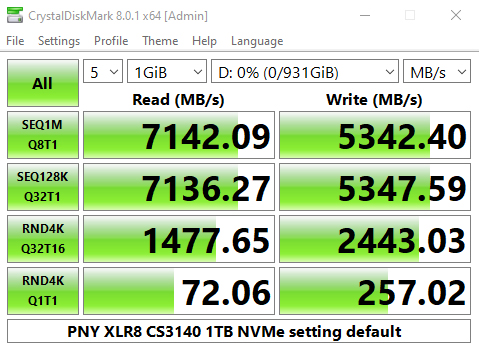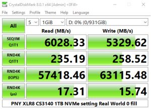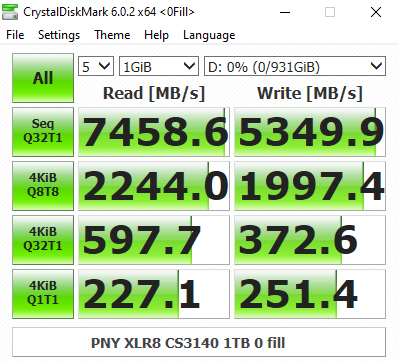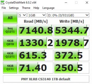 The PNY CS3140 does seem to struggle with the 4K QD32 T1 test in CrystalDiskMark 6. Having said that we could confirm the official sequential read performance figure for the drive of 7,500MB/s with a tested CDM v6 read figure of 7,458MB/s. The tested best write figure of 5,349MB/s is a little short of the official sequential maximum of 5,650MB/s.