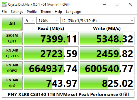 The best tested random 4K figures in CDM8 for the drive are 664,937.74 IOPS for reads and 600,540.77 IOPS for writes. Unfortunately, we couldn't confirm how these figures match up to the official ones as PNY don't have the random performance figures featured on any specification sheet for the drive we've seen.