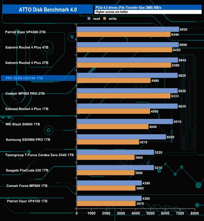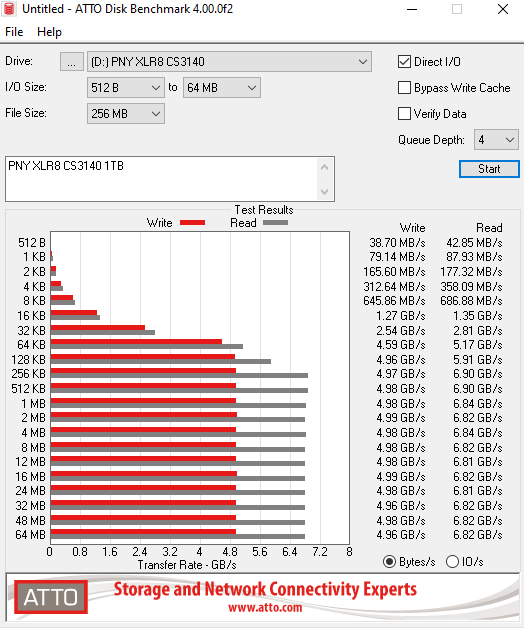 In the ATTO benchmark test, both the 6,820MB/s read figure and the 4,990MB/s for writes are some way short of the official maximums of 7,500MB/s for reads and 5,650MB/s for writes.