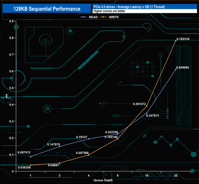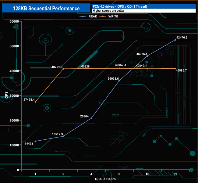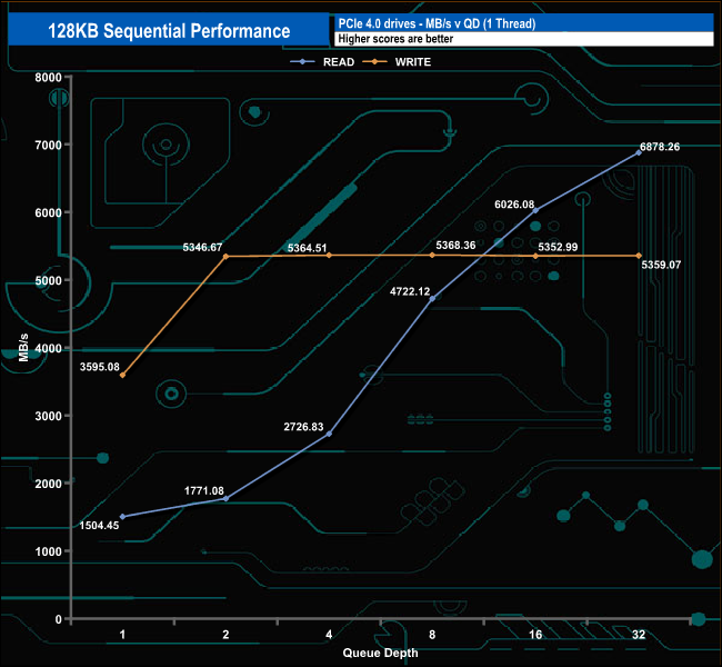 We used CrystalDiskMark 8‘s custom settings to test the sequential read and write performance of the drive through a range of queue depths. The setup for the tests is listed below.