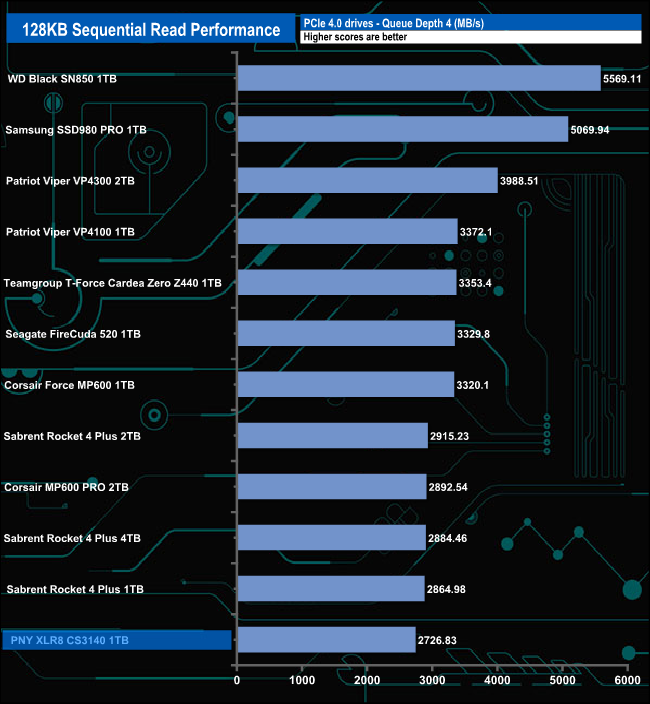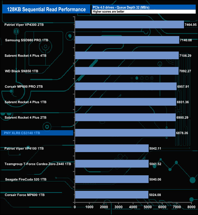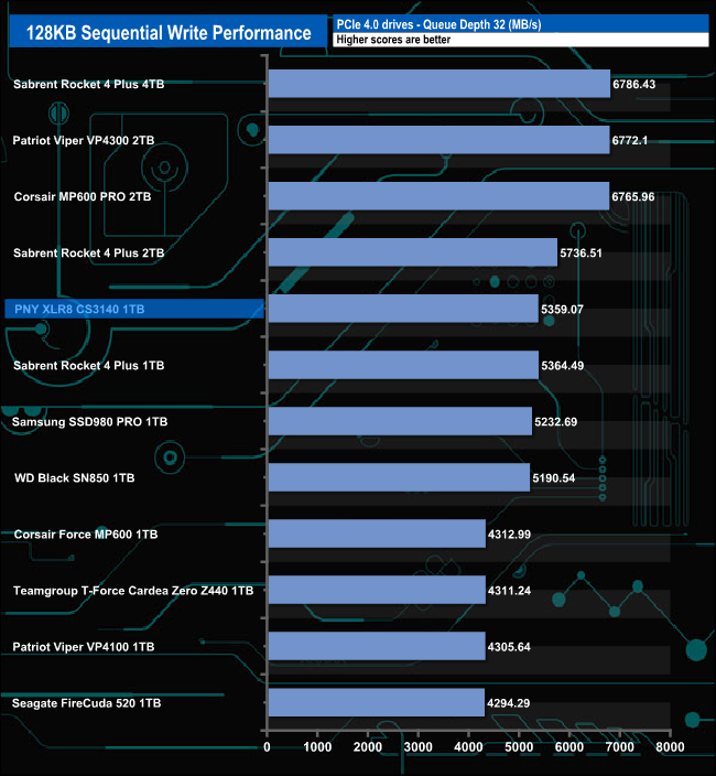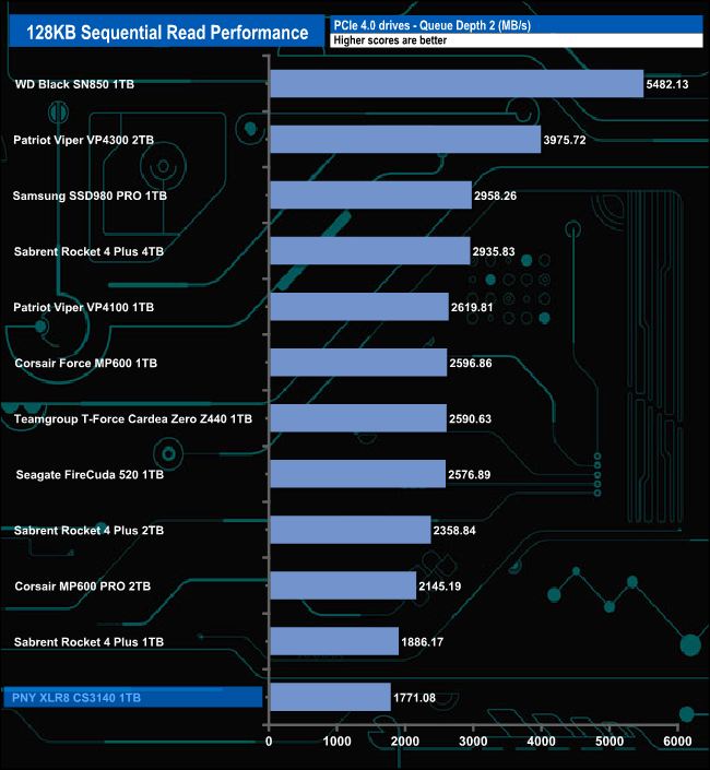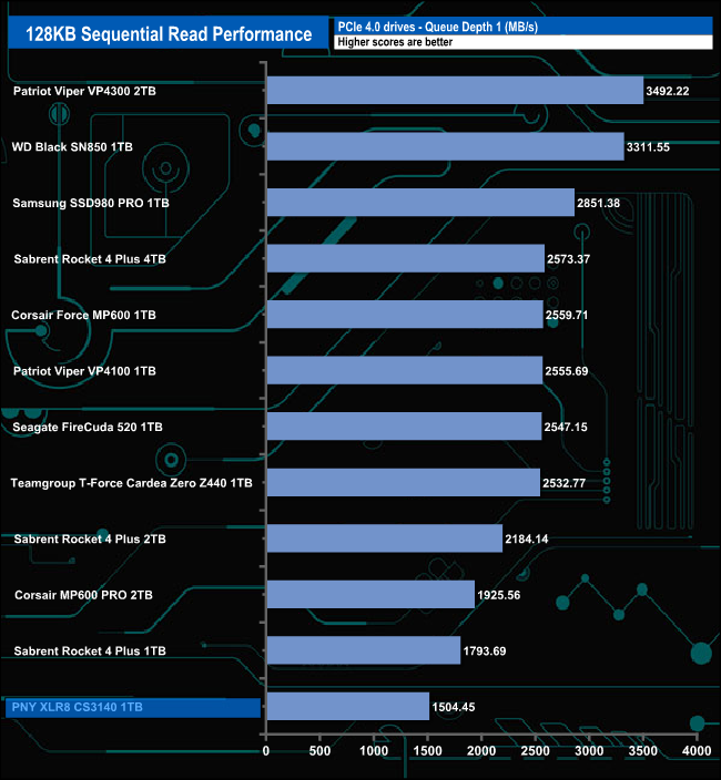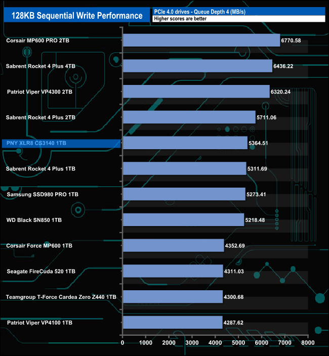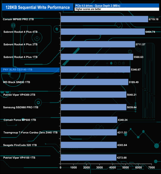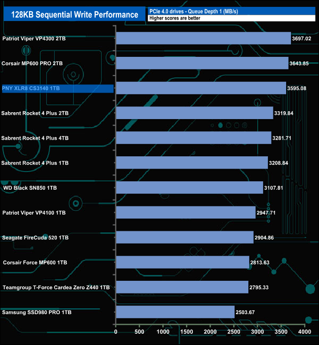 At a QD of 1, the PNY CS3140 sits in third place on the results chart behind the Patriot Viper VP4300 and the Corsair MP600 PRO but it drops down the table as the queue depth begins to deepen.