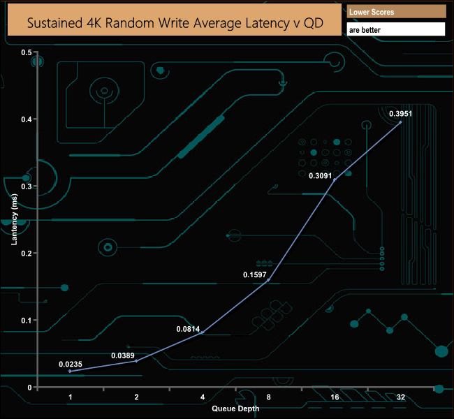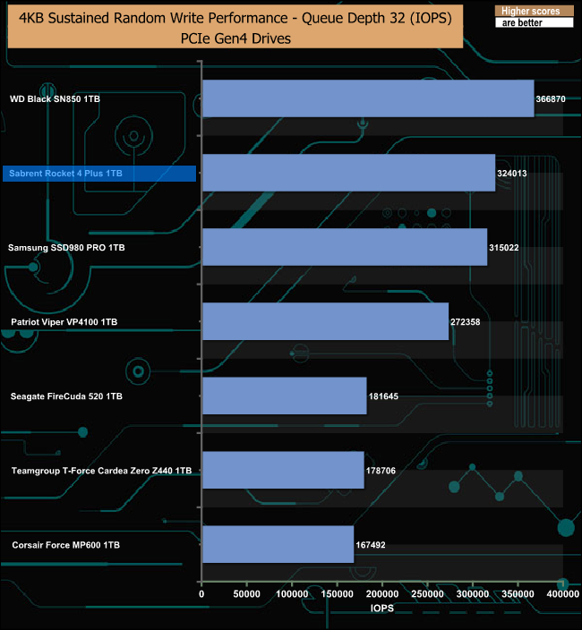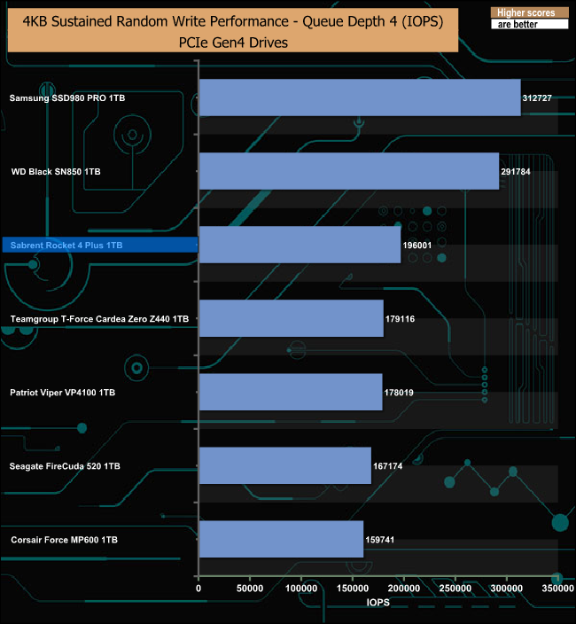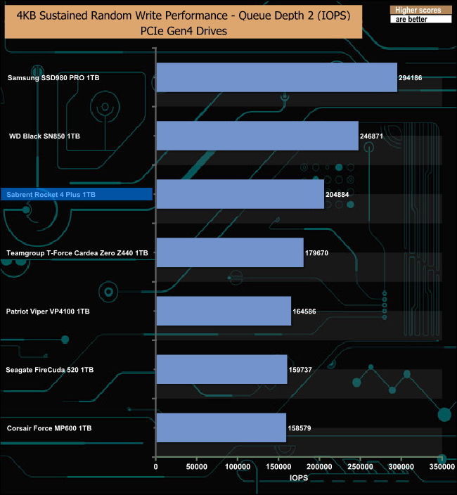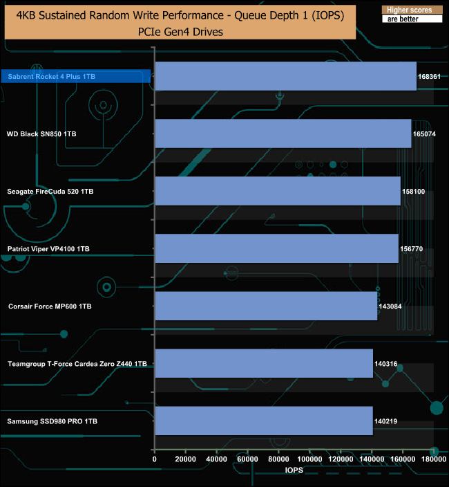 At QD1, the Rocket 4 Plus tops the results chart at 168,361 IOPS. At QDs 2 and 4, it falls below the Samsung and WD drives before climbing above the Samsung drive into second place behind WD's Back SN850 drive at QD32.