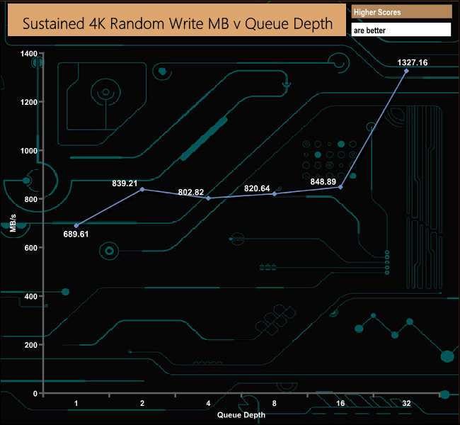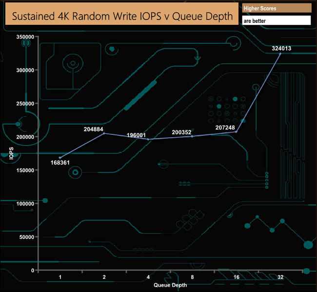 The official 4K random write rating for the Rocket 4 Plus is up to 700,000 IOPS. As you can see from our 4-threaded test results we couldn't get close to that figure, the best we saw was 324,013 IOPS at QD32. We did a quick test at QD32 using 8 threads and saw the IOPS figure rise to 490,121 IOPS.