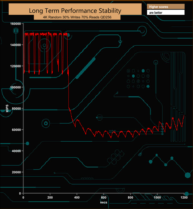 For the long term performance stability test, we set the drive up to run a 20-minute 4K random test with a 30% write, 70% read split, at a Queue Depth of 256 over the entire disk. The 1TB Sabrent Rocket 4 Plus averaged 83,504 IOPS for the test with a performance stability of 55%.