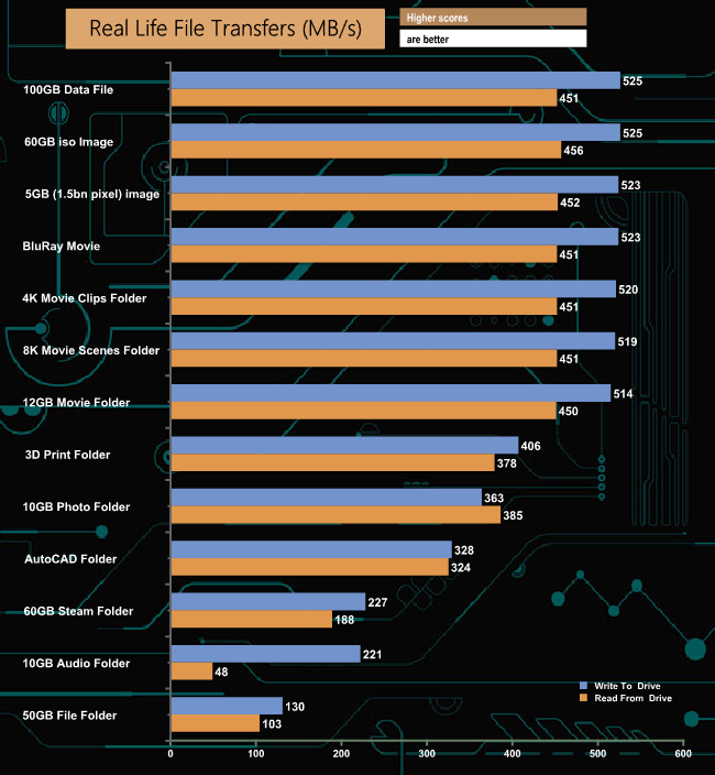 Sabrent's Rocket 4 Plus dealt with our real-life file transfers without any problems, showing very good consistency of performance for both reads and writes when dealing with the larger file sizes.