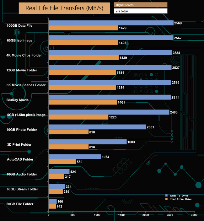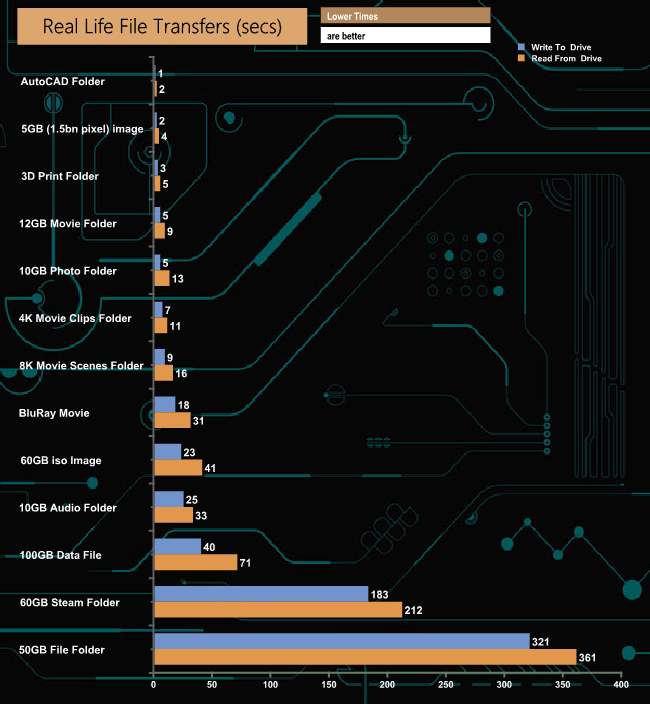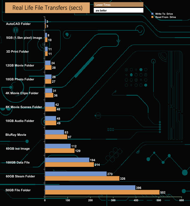 Switching over to the NVMe drive to transfer data to and from the Rocket 4 Plus saw transfer speeds for the large file transfers rocket and times taken drop dramatically. Eight of the transfers topped well over 2GB/s with six of the eight climbing above 2.5GB/s. Of the remaining five tests, two topped 1GB/s.
