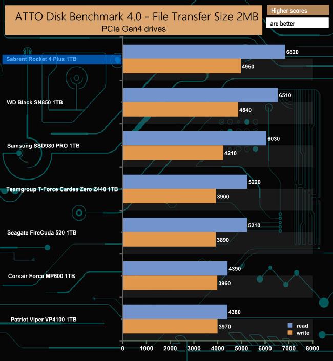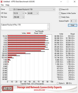 Sabrent rate the 1TB Rocket 4 Plus at up to 7,000MB/s for Sequential reads and while we couldn't quite match that maximum figure with the ATTO benchmark result of 6,820MB/s, but even so, that test result makes the drive the fastest Gen 4 drive we have seen to date. In a similar vein, we couldn't match the official maximum Sequential write rating of 5,300MB/s with a test result figure of 4,950MB/s, but once again it's the fastest we've seen to date for a Gen 4 drive.
