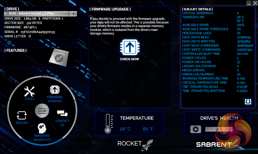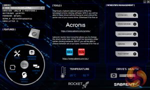 Sabrent’s SSD management software goes by the name Rocket Control Panel. It has a fancy, easy to use GUI and it allows you to all the usual things like checking the drive’s health and updating the firmware. It also has a link to download a copy of Acronis True Image for Sabrent.