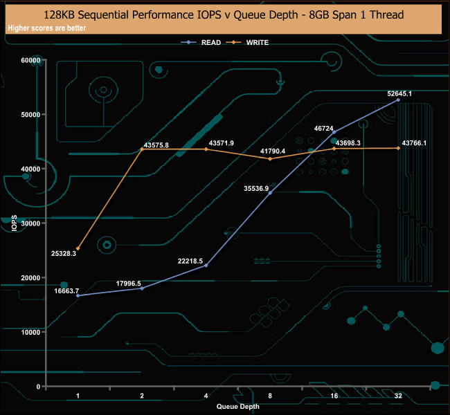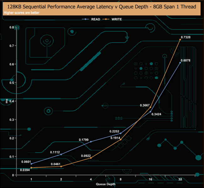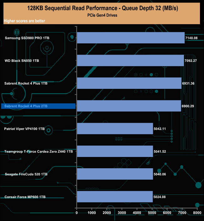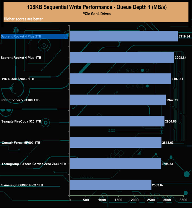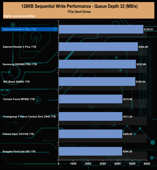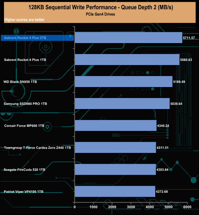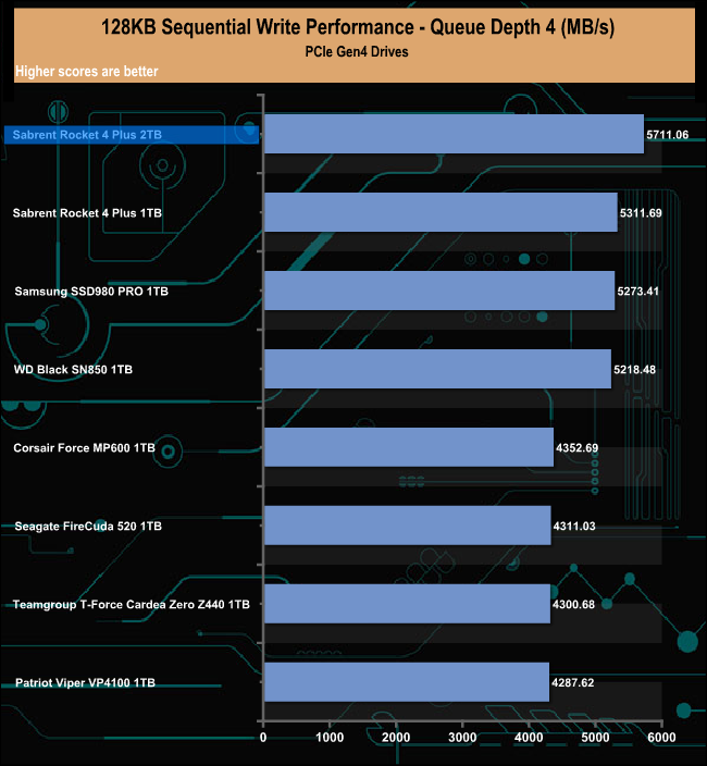 Unlike the Sequential read performance, when it came to the Sequential write tests, there wasn’t a QD where the 2TB Rocket 4 Plus isn’t the fastest drive we’ve seen to date.