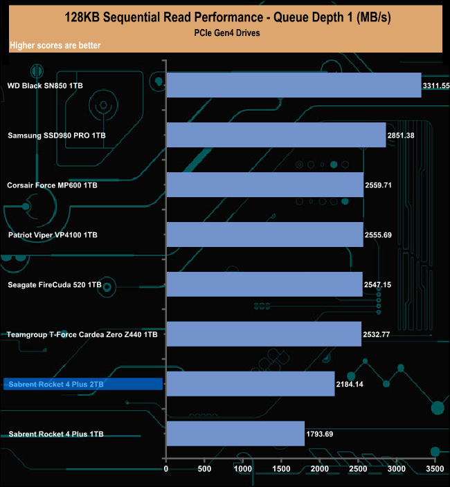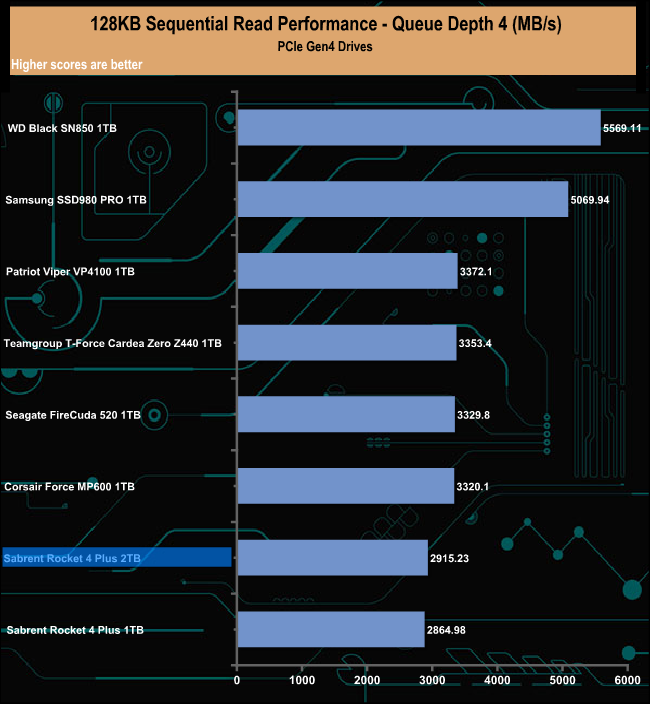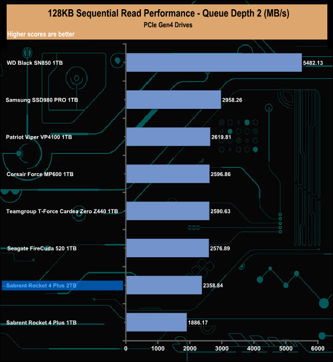 The 2TB version of the Rocket 4 Plus out performs the 1TB version at QD's 1-4. However at a QD of 32 the 1TB drive has a slight edge.