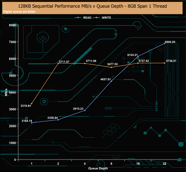 With our own Sequential tests we couldn’t quite hit the official maximums for either read or writes. Our read result of 6,900MB/s isn't too far short of the official 7,100MB/s while the write score of 5,736MB/s is bit further off the official 6,600MB/s.
