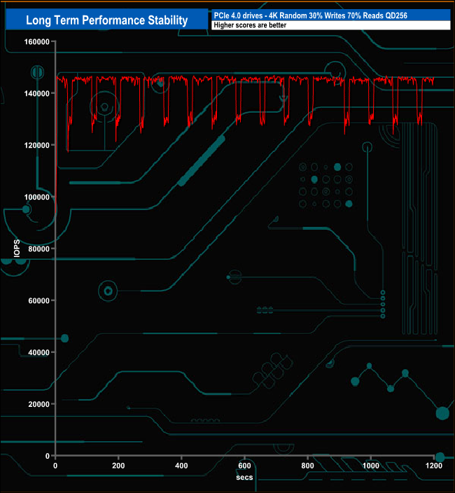 For the long term performance stability test, we set the drive up to run a 20-minute 4K random test with a 30% write, 70% read split, at a Queue Depth of 256 over the entire disk. The 4TB Sabrent Rocket 4 Plus averaged 142,565 IOPS for the test with a performance stability of 97% which is enterprise-grade stability.
