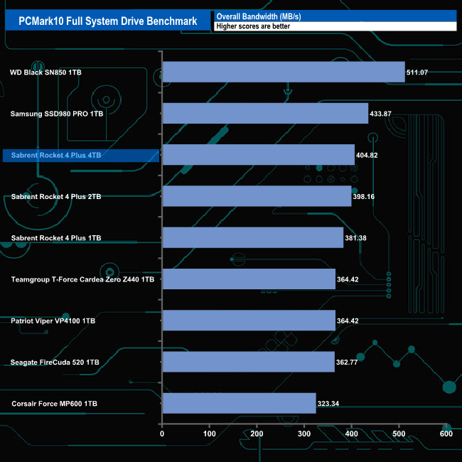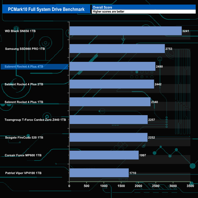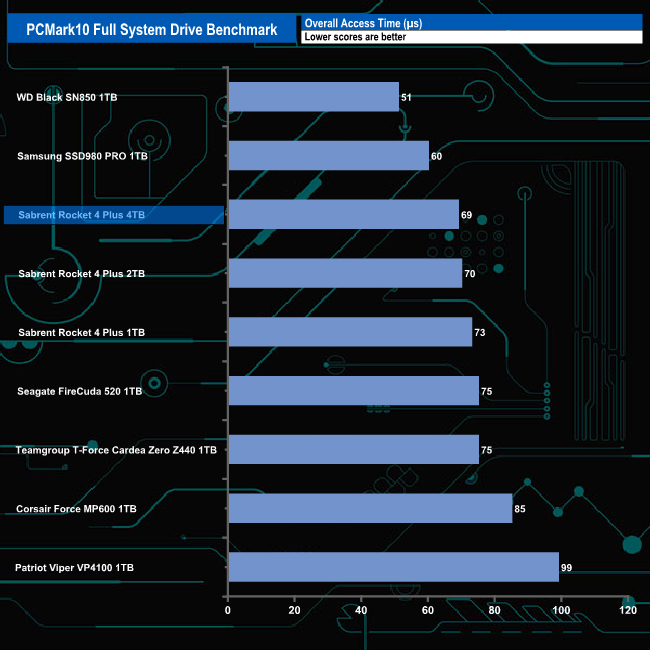 Overall in PCMark 10’s Full System Drive benchmark, Sabrent's 4TB Rocket 4 Plus sits behind WD’s Black SN850 and Samsung SSD 980 PRO. It is the fastest of the Phison E18 powered drives we’ve tested to date.