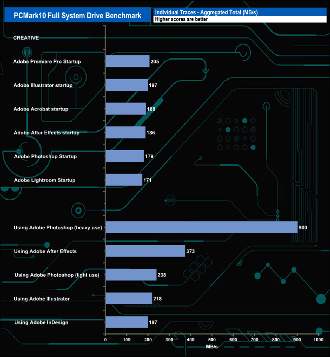The PCMark 10 Full System Drive Benchmark uses a wide-ranging set of real-world traces from popular applications and common tasks to fully test the performance of the fastest modern drives. The benchmark is designed to measure performance of fast system drives using the SATA bus at the low end and devices connected via PCI Express at the high end.