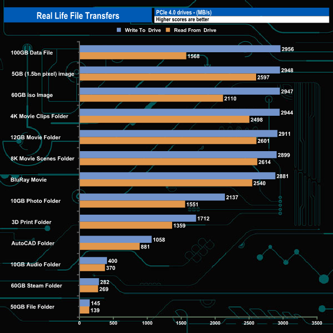 Switching over to the NVMe drive to transfer data to and from the 4TB Rocket 4 Plus saw transfer speeds for the large file transfers rocket and times taken drop dramatically. Seven of the transfers topped well over 2.5GB/s for writing to the drive with four just a shade under 3GB/s.
