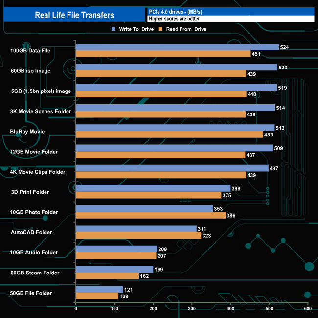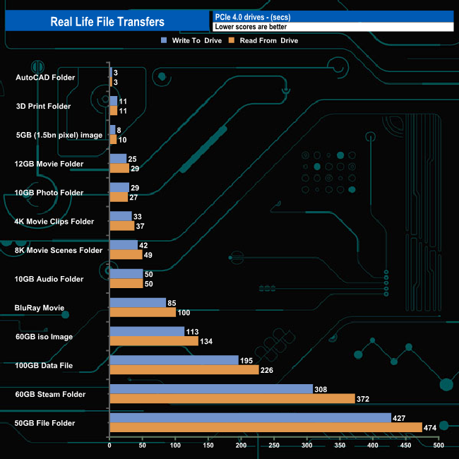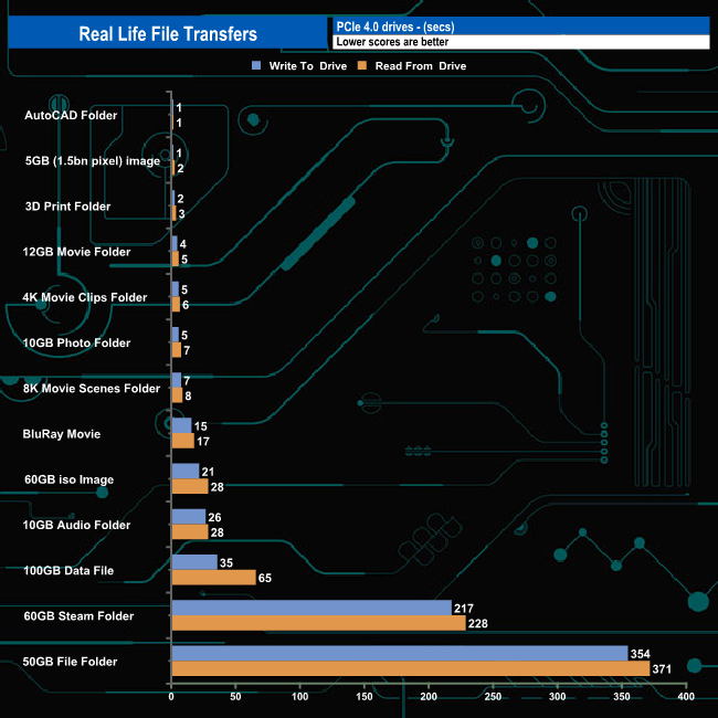 Sabrent’s Rocket 4 Plus dealt with our real-life file transfers without any problems, showing very good consistency of performance for both reads and writes when dealing with the larger file sizes, averaging 441MB/s when writing to the drive and 377MB/s when reading the data back. As usual, it's the small files in the Audio, Steam and File folders that cause the drive to slow down.