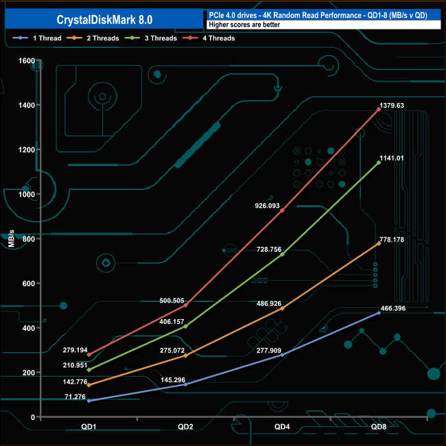 We also used CrystalDiskMark 8 to test the random performance of the drive at lower queue depths (QD1 – QD8 where most of the everyday workloads occur) using 1 to 4 threads.