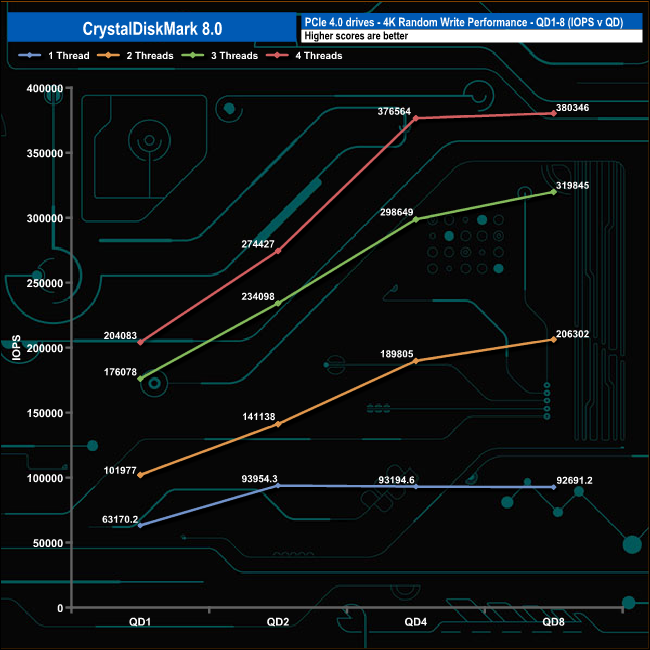 In the write tests, the best performance figure we saw was the 380,346 IOPS (1,557MB/s) using 4 threads at a QD of 8.