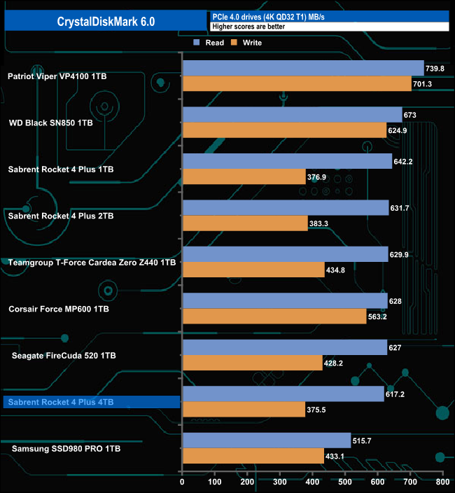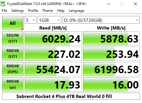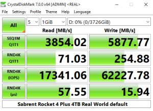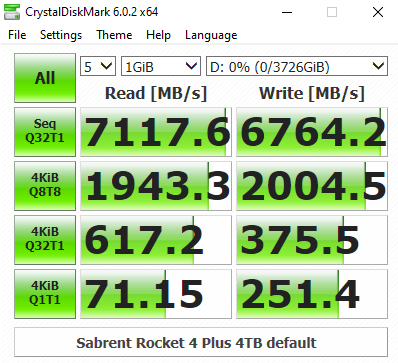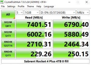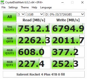Of the three Rocket 4 Plus drives we've looked at the 4TB model appears to struggle the most with the CrystalDiskMark 6 4K QD32 test. Comparing the two CrystalDiskMark result screens shows that the E18 controller that the Rocket 4 Plus uses is much more efficient when reading compressible Sequential and 4K data at certain queue depths.