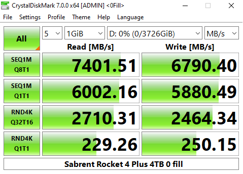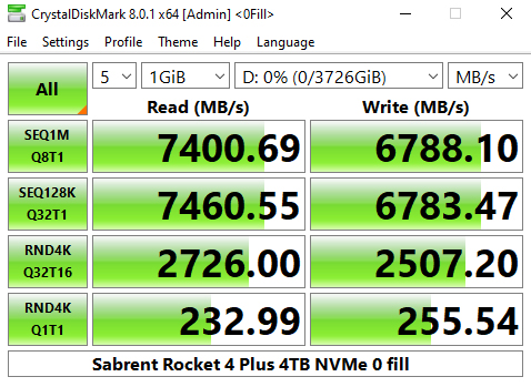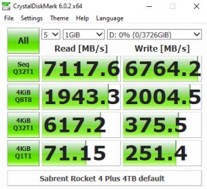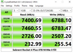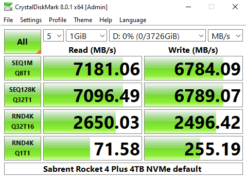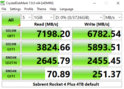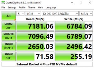 Using the default NVMe setting which forms part of CrystalDiskMark’s v8.0.0 benchmark, we could again confirm the official maximum Sequential read figure of 7,200MB/s with a best test performance of 7,400MB/s. Tested Sequential writes came in at 6,788MB/s, a little short of the official maximum 6,900MB/s figure.