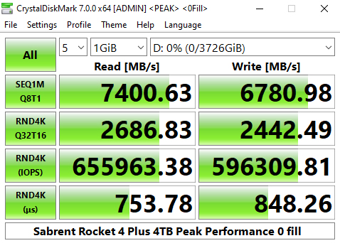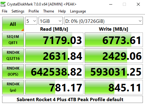 Looking at the results for the Peak Performance profile, we could confirm the official 7,200MB/s Sequential read performance figure with a best test result of 7,401MB/s, however, the best write figure we saw was 6,790MB/s, some way off the official 6,900MB/s.