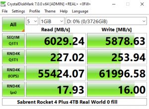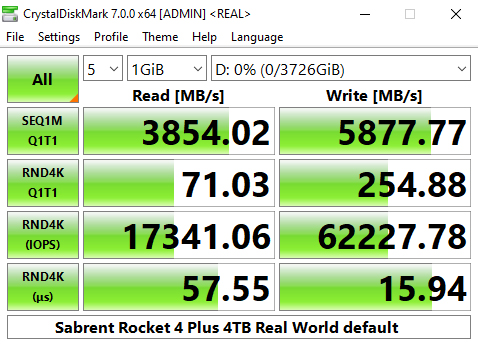 CrystalDiskMark, version 7, includes a couple of profiles that can be used for testing – Peak Performance and Real World. The result screens for these two profiles not only display MB/s results but also IOPS and latency.